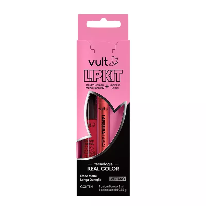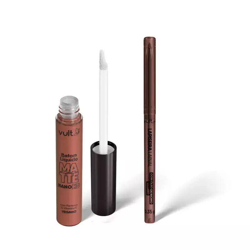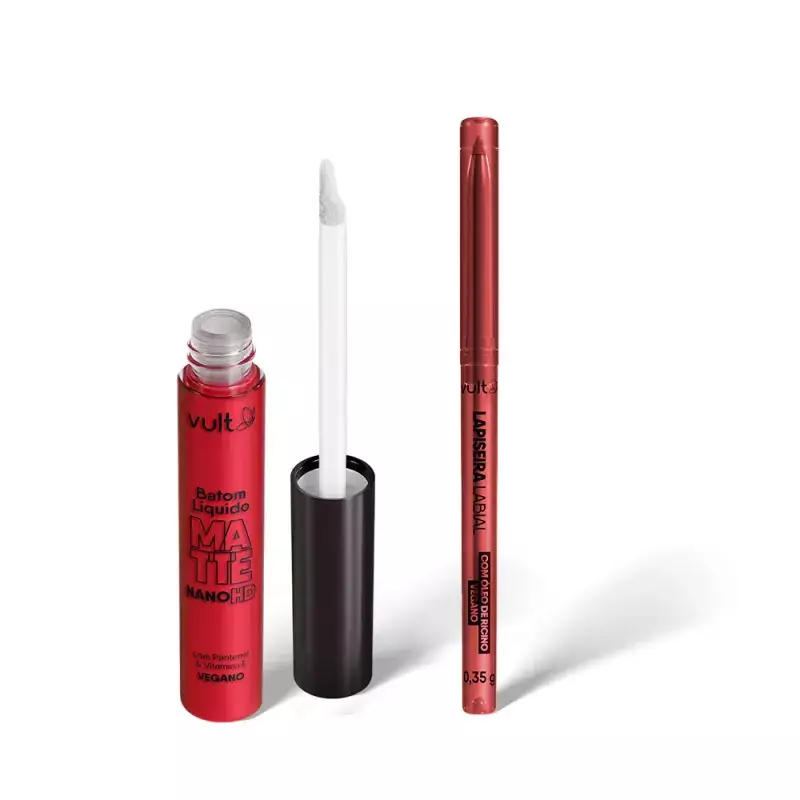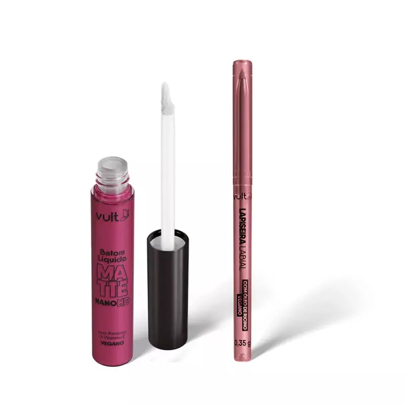 LipKit Vult: Batom Líquido Matte Nano HD 5ml + Lapiseira Labial 0,35gEm edição limitada, OLip Kit Vultcombina dois produtos indispensáveis em um único kit: enquanto a lapiseira é ótima para delinear e contornar os lábios de forma precisa, o batom líquido matte tem alta pigmentação e acabamento superconfortável. Confira: