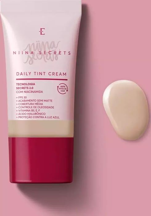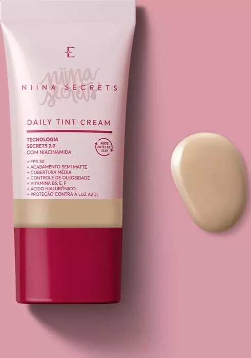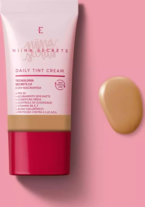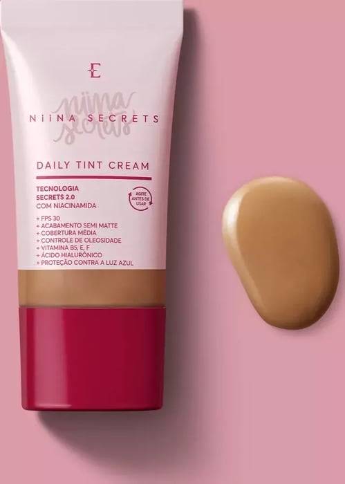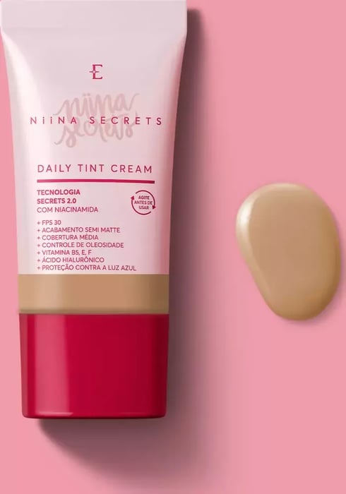 Base Líquida Daily Tint Cream Niina Secretsé otratamento diário 24hna primeira etapa da make que vai deixar a sua pele radiante! Com11 benefícios em 1só produto, é umabase protetora multifuncionalindispensável para levar naquelekit maquiagemque sempre te acompanha: