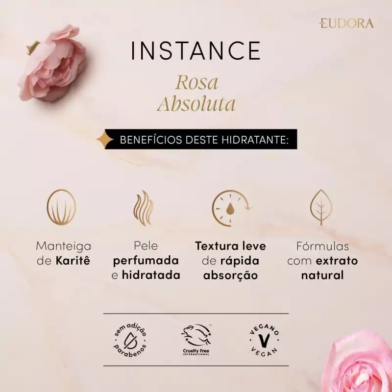 A linha completa conta com fragrâncias envolventes como Instance<a href="https://www.eudora.com.br/instance/maracuja/" rel="noopener noreferrer" target="_blank" style="box-sizing: inherit; margin: 0px; padding: 0px; -webkit-font-smoothing: antialiased; cursor: pointer; outline: 0px; overflow-wrap: break-word; text-decoration-line: none !important; font-weight: 700 !important;">Maracujá</a>,<a href="https://www.eudora.com.br/instance/instance-karite/" rel="noopener noreferrer" target="_blank" style="box-sizing: inherit; margin: 0px; padding: 0px; -webkit-font-smoothing: antialiased; cursor: pointer; outline: 0px; overflow-wrap: break-word; text-decoration-line: none !important; font-weight: 700 !important;">Instance Karité Eudora</a>,<a href="https://www.eudora.com.br/instance/instance-baunilha/" rel="noopener noreferrer" target="_blank" style="box-sizing: inherit; margin: 0px; padding: 0px; -webkit-font-smoothing: antialiased; cursor: pointer; outline: 0px; overflow-wrap: break-word; text-decoration-line: none !important; font-weight: 700 !important;">Instance Baunilha Eudora</a>,<a href="https://www.eudora.com.br/instance/algodao-e-jasmim/" rel="noopener noreferrer" target="_blank" style="box-sizing: inherit; margin: 0px; padding: 0px; -webkit-font-smoothing: antialiased; cursor: pointer; outline: 0px; overflow-wrap: break-word; text-decoration-line: none !important; font-weight: 700 !important;">Instance Algodão e Jasmim</a>,<a href="https://www.eudora.com.br/instance/cereja-e-amendoas/" rel="noopener noreferrer" target="_blank" style="box-sizing: inherit; margin: 0px; padding: 0px; -webkit-font-smoothing: antialiased; cursor: pointer; outline: 0px; overflow-wrap: break-word; text-decoration-line: none !important; font-weight: 700 !important;">Instance Cereja e Amêndoas</a>e<a href="https://www.eudora.com.br/instance/instance-frutas-vermelhas/" rel="noopener noreferrer" target="_blank" style="box-sizing: inherit; margin: 0px; padding: 0px; -webkit-font-smoothing: antialiased; cursor: pointer; outline: 0px; overflow-wrap: break-word; text-decoration-line: none !important; font-weight: 700 !important;">Instance Frutas Vermelhas</a>. Aproveite e garanta o seu já que você não vai se arrepender!
