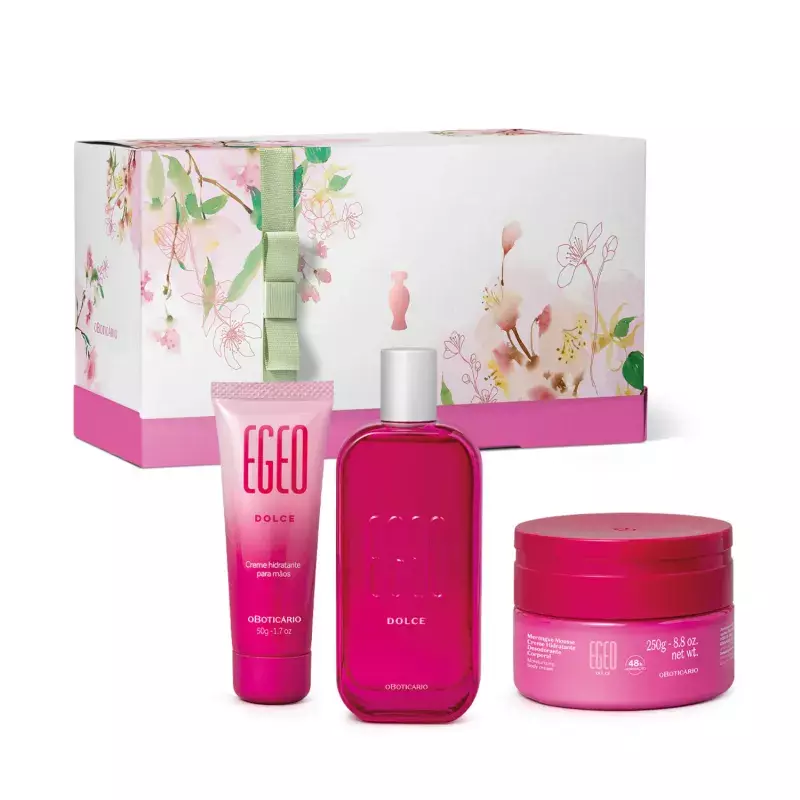 OKit Presente Dia das Mães Egeo Dolcetransmite toda doçura e carinho para a mulher mais especial da sua vida. Ele vem com três itens através da fragrância doce da linha no desodorante colônia, na textura indescritível do merengue hidratante e no prático autocuidado do hidratante para as mãos. Para deixar tudo mais especial, o kit vempronto para presentearem uma caixa para presente que transmite cuidado em cada detalhe:
