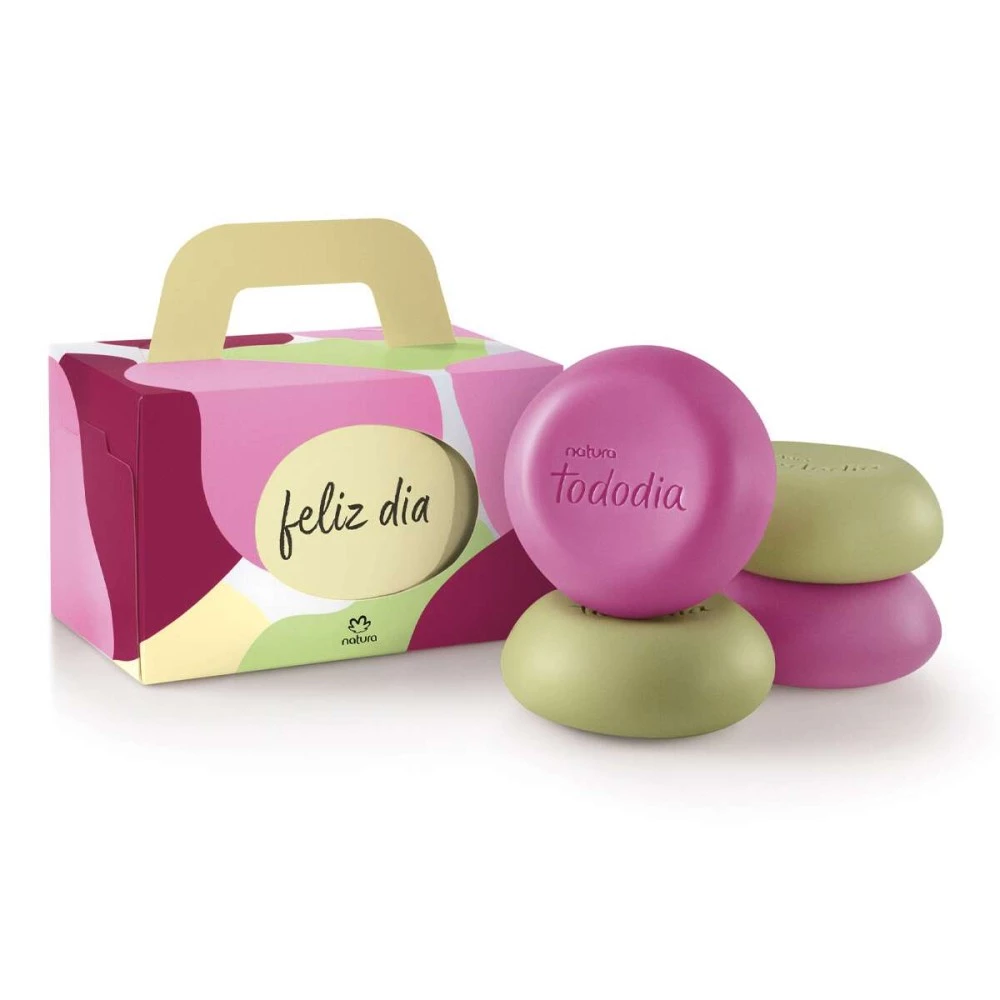 Deixe o dia de alguem especial mais feliz com o Presente Natura Tododia Sabonetes em Barra Sortidos, que vem com 4 sabonetes nas fragrâncias de sucesso da marca: Alecrim e sálvia e Ameixa e gengibre rosa. O presente já vem embalado em uma caixa com alça que facilita o transporte e traz uma mensagem comemorativa especial ("Feliz Dia"). É uma forma simples e completa para presentear.