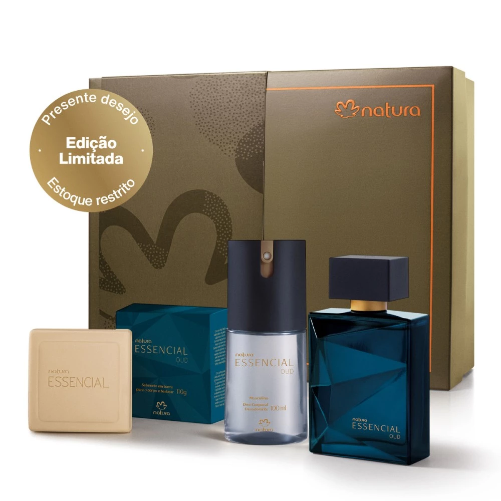 PRESENTE NATURA ESSENCIAL OUD MASCULINO DEO PARFUM 100ML+SPRAY CORPORAL+SABONETE EM BARRA