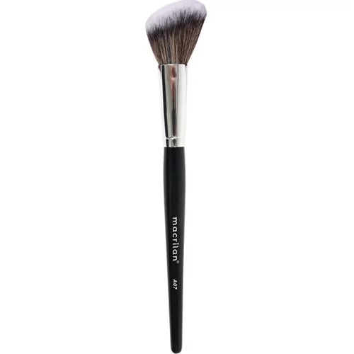 Pincel Macrilan A07, especialmente desenvolvido com cerdas sintéticas e macias, ideais para aplicar blushes, contornos e iluminadores. Possui formato angular que acompanha a curvatura do rosto, oferecendo precisão e controle, facilitando a produção da maquiagem.