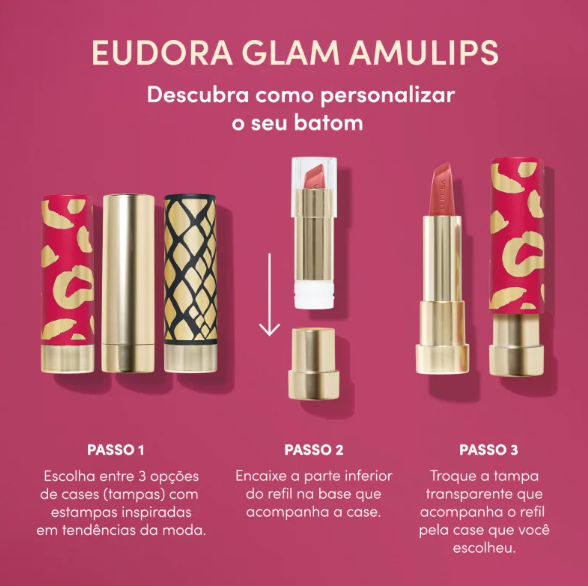 Apresentamos oEudora Glam Batom Customizável Amulips, seu novo amuleto para uma autoconfiança poderosa. Com ele, você conquista uma make glamourosa e sofisticada em apenas 5 minutos, com resultados comprovados por neurociência!*