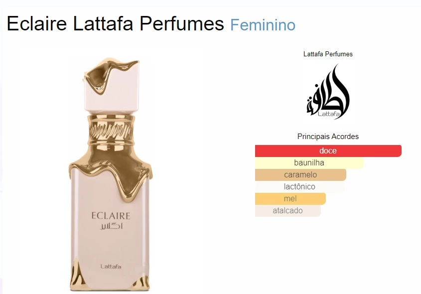 Eclaire de Lattafa Perfumes é uma fragrância Floral Frutado Gourmet Feminina, lançada em 2024. Esta nova adição à linha de perfumes da Lattafa é uma celebração da doçura e feminilidade, perfeita para mulheres que apreciam fragrâncias envolventes e gourmand.
