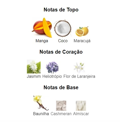 Nas notas de topo, a doçura tropical da manga se entrelaça de maneira envolvente com a suavidade do coco e a exuberância do maracujá. Essa fusão inicial é fresca e vibrante, proporcionando uma entrada memorável para a fragrância.