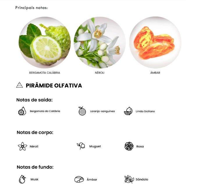 Imagine-se caminhando por um jardim secreto, onde cada nota perfumada é um convite para uma jornada emocionante. Logo na entrada, a protagonista desta criação, a Bergamota da Calábria, forma uma explosão cítrica ao se reunir com a Laranja-sanguínea e o Limão Siciliano, despertando seus sentidos. A fragrância inicia-se como uma sinfonia de notas frescas e vibrantes, como um convite para explorar um universo olfativo único. No coração deste jardim, o Néroli revela sua delicadeza, enquanto o Muguet e a Rosa adicionam uma nota floral fresca.