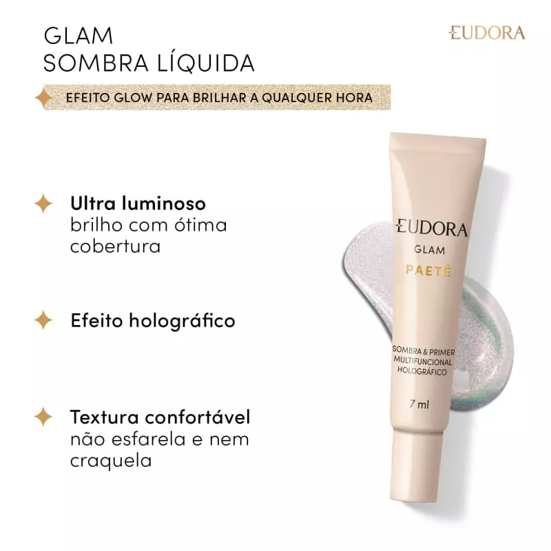 Sombra & Primer Multifuncional Holográfico Glam Paetêconta com uma fórmula com efeito ultrabrilho com ótima cobertura que não borra e nem acumula nos vincos ao longo do dia, entregando multifuncionalidade e alta fixação.