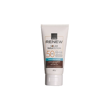 Renew apresenta o novo Solar Tripla proteção alta eficácia com alto conforto, protege e prepara a pele contra os danos dos Raios uva/uvb, antioxidante e contra a perda de colágeno* ao mesmo tempo que é fácil de espalhar e proporciona um acabamento uniforme e matte. Muito além de proteção solar, tripla proteção com efeito matificante duradouro, que protege e trata cosmeticamente a pele sem pesar. Nova fórmula, com tecnologia tripla proteção e mais efeito matte*. Tripla proteção com textura leve que previne o envelhecimento, preenche linhas finas através da hidratação e com 5 opções de tonalidade para você encontrar a sua. Novas cores, também para peles retintas! Para quem já usa bases de Avon, encontrar seu tom ficou ainda mais fácil, são 5 cores, que combinam com os tons das bases de maquiagem Avon. Nova cor desenvolvida para a pele da brasileira. Minimiza os efeitos causados pela luz visível e pelos raios infravermelhos. Indicado para pele muito sensível a queimadura solar. Tecnologia de proteção avançada. *Baseado em teste in vitro. **É necessária a reaplicação do produto a cada 2 horas para manter a sua efetividade.