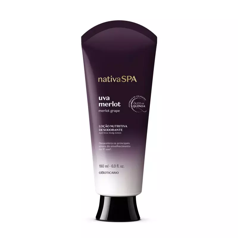 A Loção Nutritiva Desodorante Nativa Spa Uva Merlotte convida a degustar o prazer da sua própria companhia com a potência de um tratamento quedesacelera os principais sinais do tempo desde o primeiro uso¹, recuperando o tempo que sempre foi seu. A versão compacta é ideal para levar na bolsa ou nécessarie.