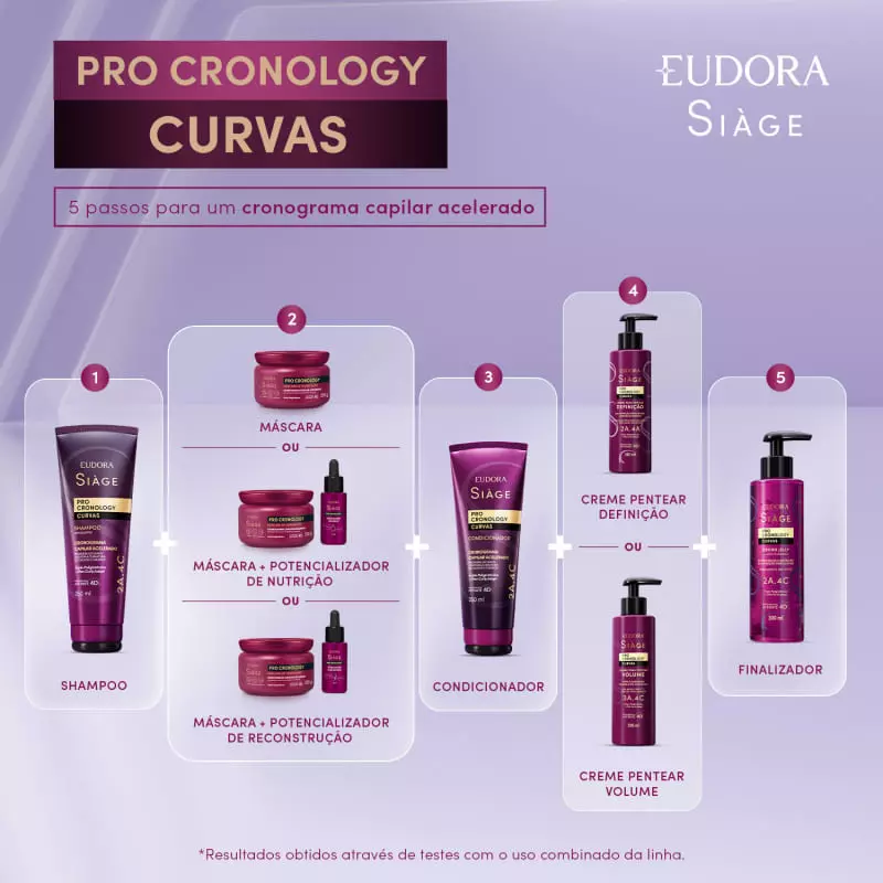 Siàge Pro Cronology Curvasuniu os maiores desejos das crespas e cacheadas em uma linha de cronograma capilar acelerado que se adequa às necessidades de diferentes curvaturas e querecupera em 2 semanasaté os danos mais severos. A linha age nas 3 etapas do cronograma proporcionando hidratação, nutrição com reposição de lipídios e uma reconstrução poderosa que repara os danos.
