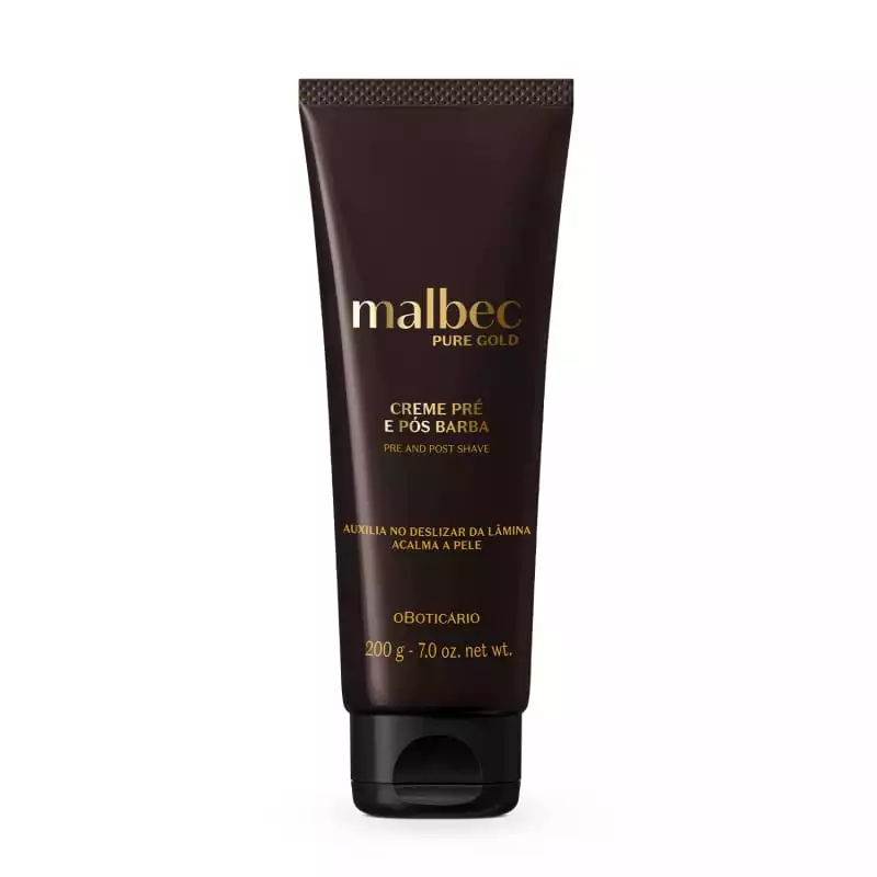 OCreme Pré e Pós-Barba Malbec Pure Gold 200gintegra a sua rotina decuidados ao barbear comcuidado, proteção e perfumação. Pode ser usado nopré-barbaeapós o barbear,deixando a pele macia, suave e perfumada com toque de sedução.